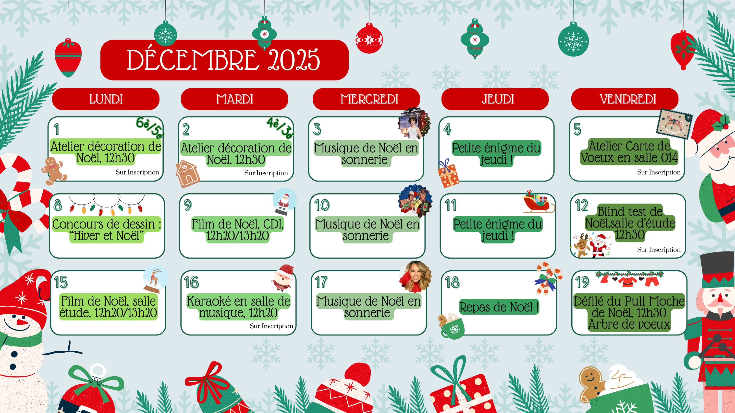 🎄 Le CVC est fier de vous présenter son Calendrier de l’Avent-Vacances, pensé pour accompagner le collège durant les trois dernières semaines dans une ambiance sereine, joyeuse et festive ! De nombreuses activités seront proposées aux élèves ! ✨
