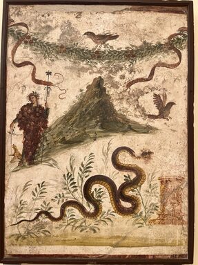L’illustration représente un dieu déguisé en grappe de raisins (lequel, donc ?) à côté d’une montagne qui n’est, à l’époque, pas encore un volcan (lequel, donc ?)